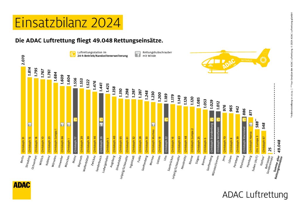 Die meisten Einsatzorte lagen 2024 in Bayern mit 12.015 (Vorjahr 12.998), hier befinden sich auch die meisten Stationen. Dahinter folgen Rheinland-Pfalz mit 7907 (8761), Nordrhein-Westfalen mit 5603 (5796) und Niedersachsen mit 5394 (5705). Bei Städten mit den meisten Alarmierungen unter den 38 Stationen liegen die ADAC Rettungshubschrauber „Christoph 31“ in Berlin (2070), „Christoph 15“ in Straubing (1814) und „Christoph 18“ in Ochsenfurt (1795) auf den vorderen Plätzen. Der 2024 neu in Itzehoe in Schleswig-Holstein stationierte „Christoph 67“ flog im ersten Halbjahr bereits 548 Einsätze.