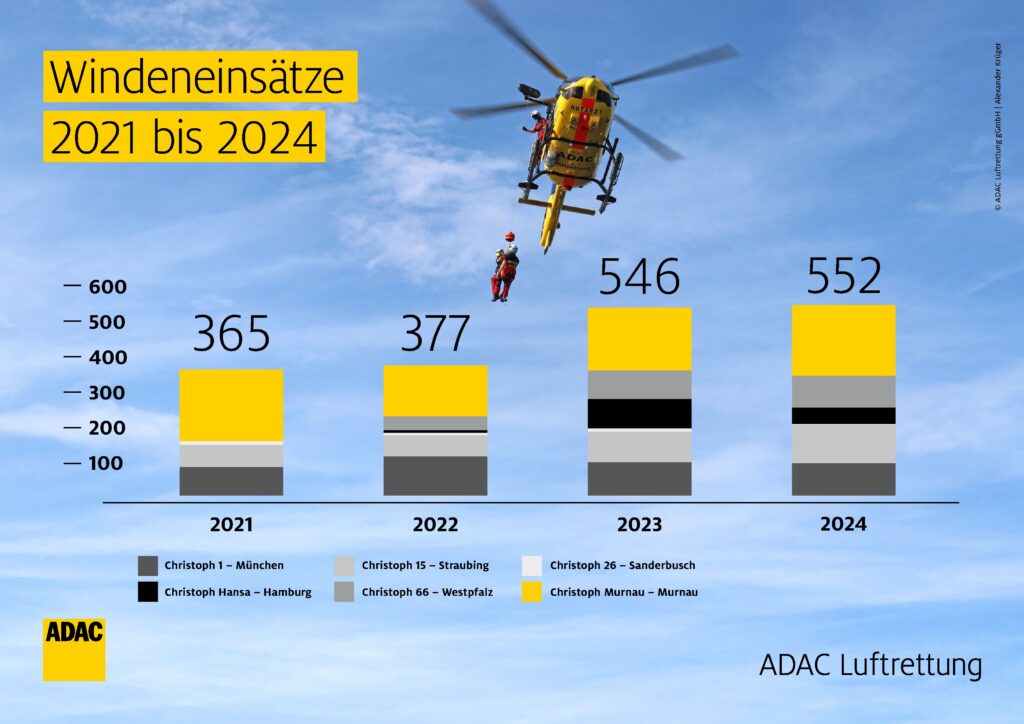 Auf hohem Niveau eingependelt haben sich Spezialeinsätze mit Rettungswinde. Die Crews der sechs Windenstationen in München, Murnau, Straubing (alle Bayern), Sande (Niedersachsen), Westpfalz (Rheinland-Pfalz) und Hamburg flogen insgesamt 552 Windeneinsätze (Vorjahr 546). Die Winde mit 90 Meter Länge und einer Traglast von rund 250 Kilogramm ermöglicht an schwer erreichbaren Einsatzorten eine erheblich schnellere Versorgung und Rettung von Patienten. Die Windenhubschrauber stehen zudem in Katastrophenfällen zur Rettung von Menschen in Notsituationen zur Verfügung. Wie wichtig diese sind, zeigte sich erneut beim jüngsten Hochwasser in Süddeutschland.