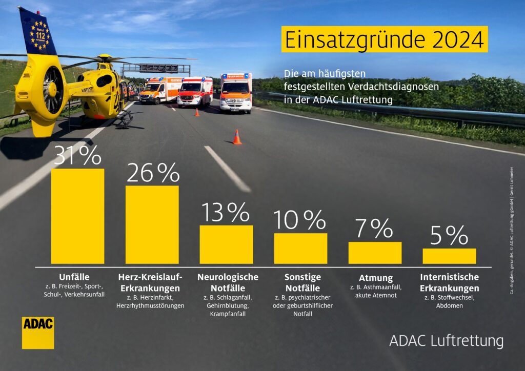 Einsatzgrund Nummer eins waren mit 31 Prozent Verletzungen nach Unfällen. Dazu gehören Freizeit-, Sport-, Arbeits-, Schul- und Verkehrsunfälle. Dahinter folgen mit 26 Prozent Notfälle des Herz-Kreislauf-Systems wie Herzinfarkte und Herzrhythmusstörungen. In 13 Prozent der Fälle diagnostizierten die Lebensretter aus der Luft neurologische Notfälle wie zum Beispiel einen Schlaganfall. Bei sieben Prozent war ein Notfall des Atmungssystems wie akute Atemnot oder Asthma die Ursache. Unter den Patienten waren mit 59 Prozent mehr Männer. Bei fast jedem zehnten Patienten handelte es sich um Kinder oder Jugendliche.