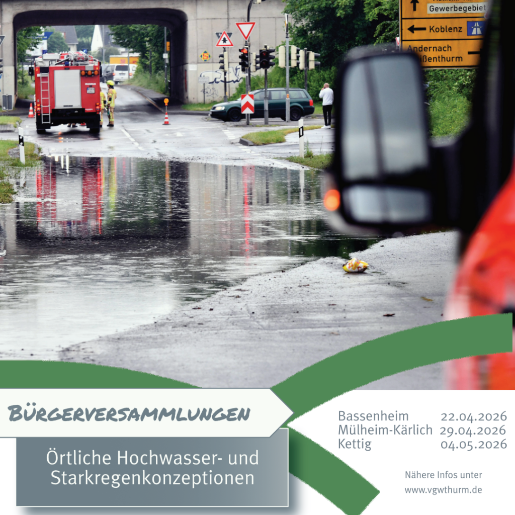 Die Verbandsgemeinde Weißenthurm lädt alle Bürgerinnen und Bürger herzlich zu Informationsveranstaltungen zum Thema „Örtliches Hochwasser- und Starkregenvorsorgekonzept“ ein.