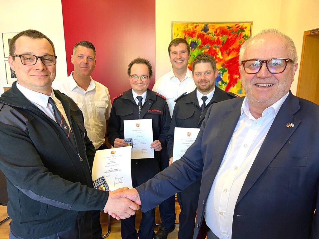 Zu den Terminen begrüßte Enders neben dem Brand- und Katastrophenschutzinspekteur Björn Jestrimsky auch Kreisjugendfeuerwehrwart Gerrit Lindlein sowie den Vorstandsvorsitzenden der Sparkasse Westerwald-Sieg, Dr. Andreas Reingen.