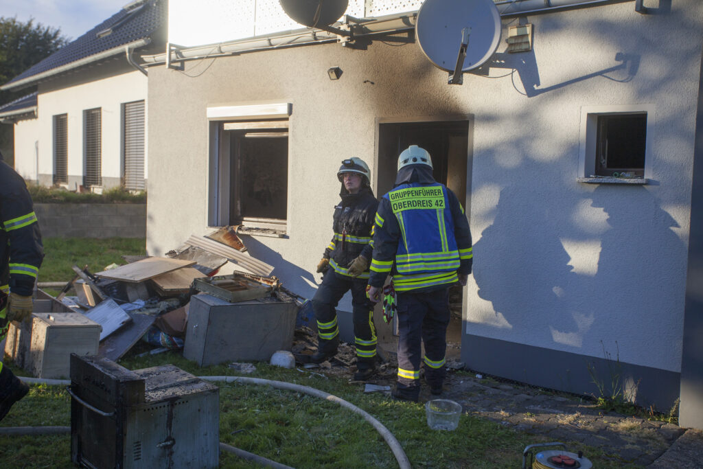 Durch eine Rauchgasdurchzündung stand der Raum, noch bevor die Löscharbeiten beginnen konnten, in Vollbrand. Der Brand konnte zügig durch einen Innen- und Außenangriff unter Kontrolle gebracht werden. Das Mobiliar wurde sukzessive ins Freie gebracht und dort abgelöscht. Die Flammen griffen nicht auf das Wohnhaus über. Der dort eingedrungene Rauch wurde mittels Lüfter beseitigt. Das Haus ist weiterhin bewohnbar. Der Anbau wurde durch das Feuer und die Hitzeentwicklung sehr stark in Mitleidenschaft gezogen.