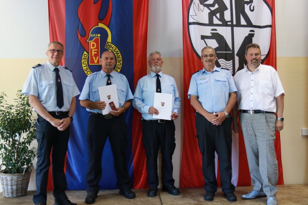Vier langjährige Kameraden wurden aus dem aktiven Einsatzdienst verabschiedet: Karl-Heinz Broich, Werner Salz, Helmut Schumacher und Heinz-Peter Stockhausen (alle Buchholz bzw. Strauscheid). Bürgermeister Christ dankte ihnen für ihren jahrzehntelangen Dienst und überreichte traditionell ein Miniatur-Tanklöschfahrzeug mit „besonderem Tankinhalt“ als Zeichen der Wertschätzung.