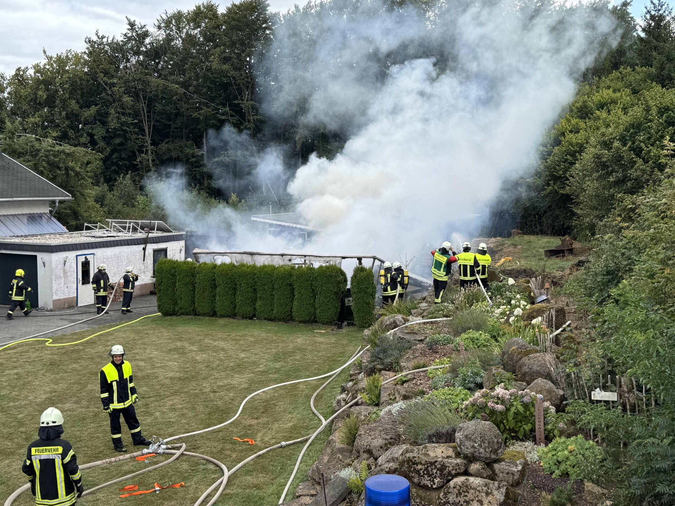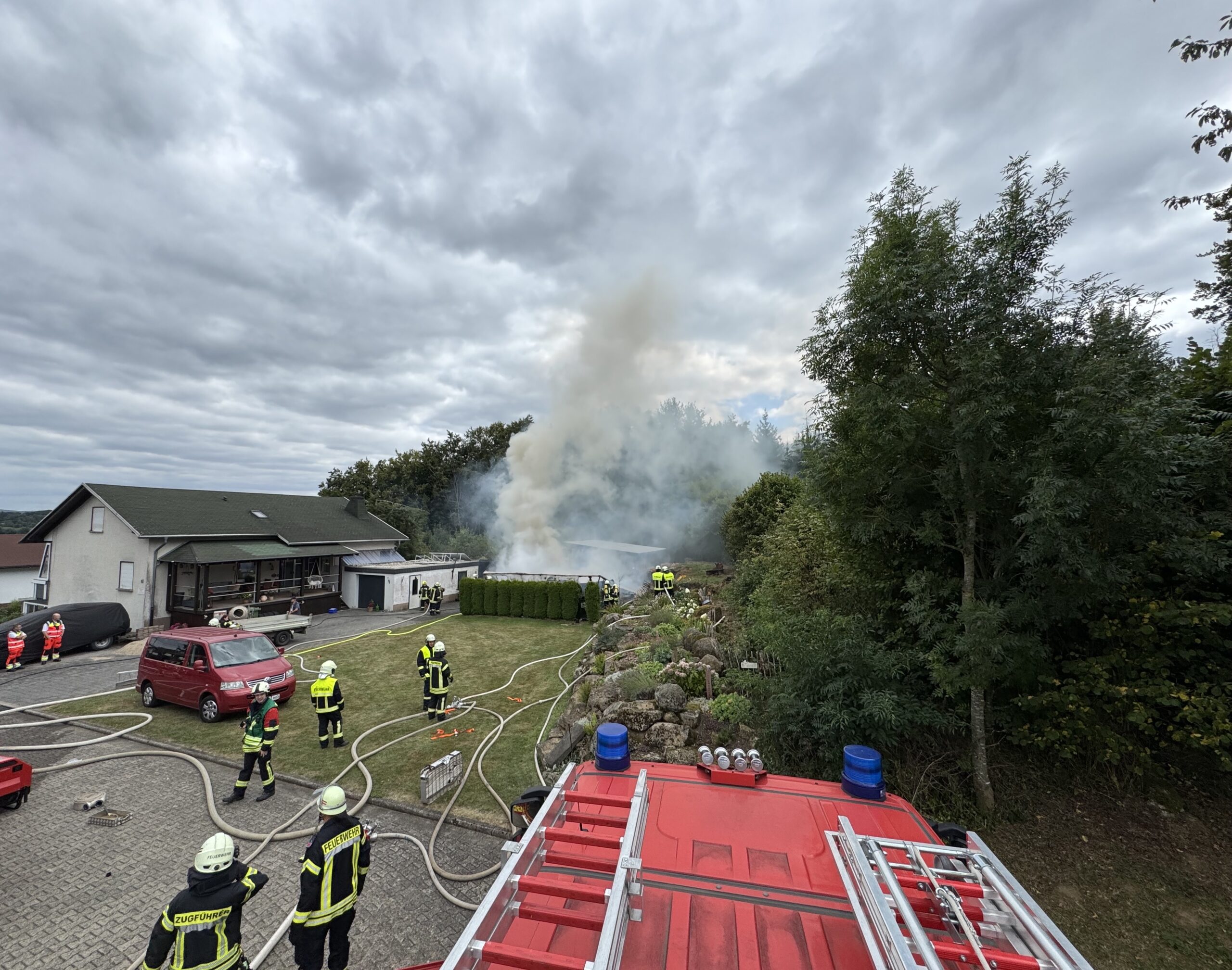 Beim Eintreffen stellte sich heraus, dass eine Hobbywerkstatt, die unmittelbar an ein Wohnhaus sowie ein Waldstück angrenzte, in voller Ausdehnung brannte. Die Einsatzkräfte bauten sofort eine Wasserversorgung auf, während erste Trupps unter Atemschutz mit Strahlrohren zur Brandbekämpfung vorgingen. Durch die enorme Hitzeentwicklung öffneten sich Sicherheitsventile mehrerer in der Werkstatt gelagerter Gasflaschen – das entweichende Gas entzündete sich unmittelbar.