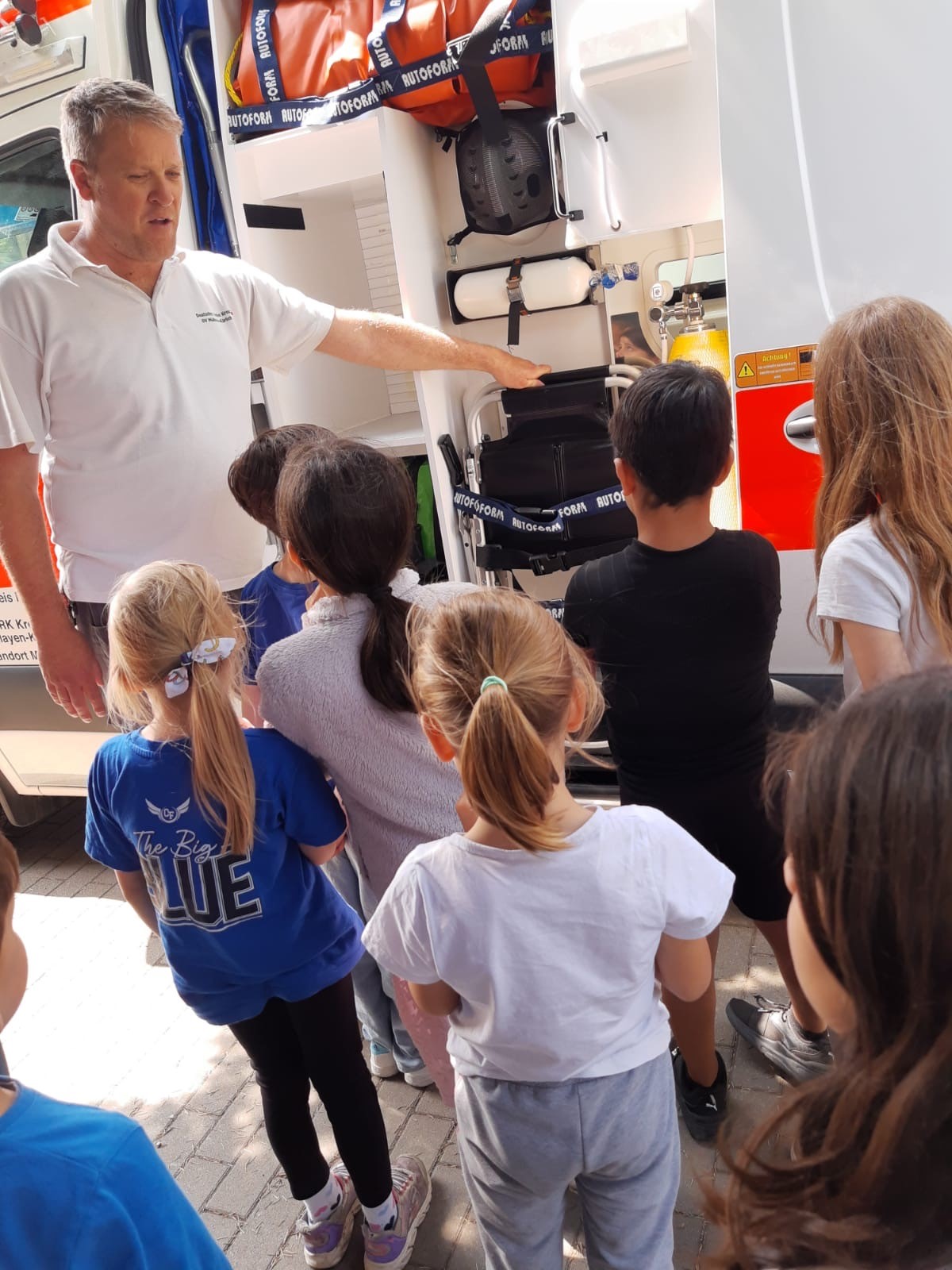 Am 28.05.2025 und am 04.06.2025 verwandelte sich der Schulhof sowie die Räumlichkeiten des pädagogischen Nachmittagsangebotes der Lindenbaum Grundschule in ein kleines Rettungszentrum: Ein Rettungswagen des Ortsvereins Mülheim Kärlich e.V des Deutschen Roten Kreuzes (DRK) fuhr vor, um den Kindern der Nachmittagsbetreuung einen spannenden Einblick in die Welt der Ersten Hilfe zu geben.