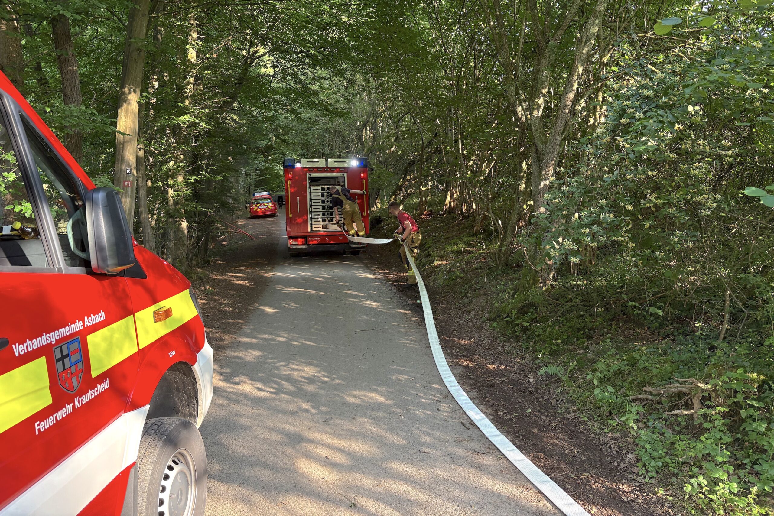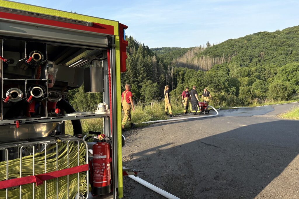 Ein Schlauchwagen aus Krautscheid kam für diese Aufgabe zum Einsatz. Die Strecke überwand dabei eine Höhendifferenz von über 50 Metern, weshalb eine zusätzliche Verstärkerpumpe nötig war. Diese wurde durch das Tragkraftspritzenfahrzeug aus Windhagen betrieben. Am Ende der Förderstrecke wurde ein Faltbehälter errichtet, aus dem das Löschfahrzeug das benötigte Wasser ansaugen konnte, um die eingesetzten Einsatzkräfte mit Löschwasser zu versorgen.