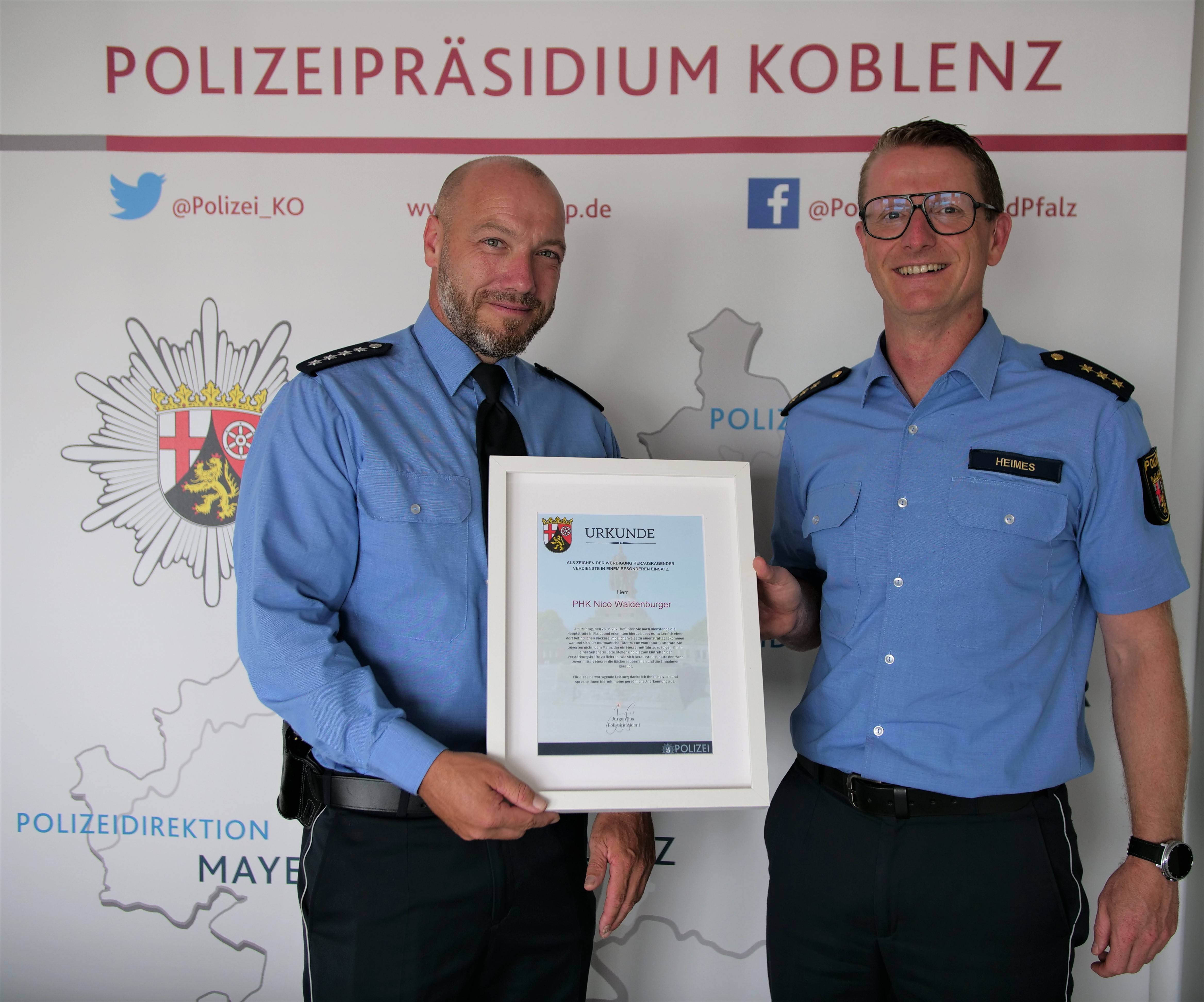Am heutigen Donnerstag wurde Polizeihauptkommissar Nico Waldenburger von der Polizeiinspektion Andernach offiziell für seinen couragierten Einsatz außerhalb des Dienstes ausgezeichnet. In einer kleinen Feierstunde überreichte ihm der stellvertretende Behördenleiter, Polizeidirektor Stefan Heimes, im Beisein von Dienststellenleiter Polizeioberrat Martin Hoch und dem örtlichen Personalratsvertreter Markus Landsrath die Belobigungsurkunde.