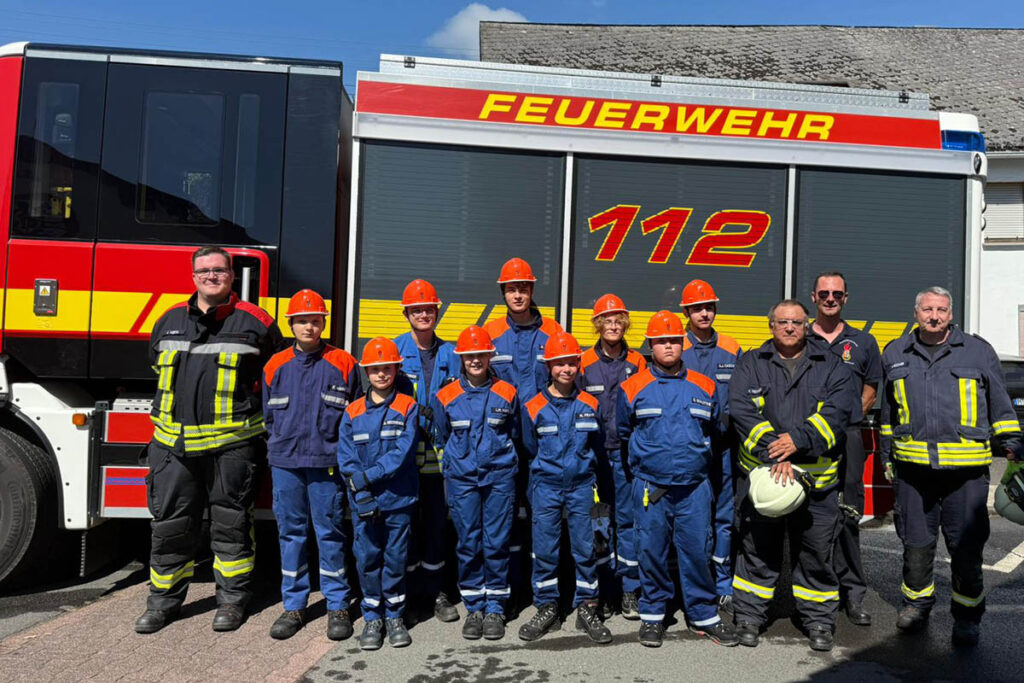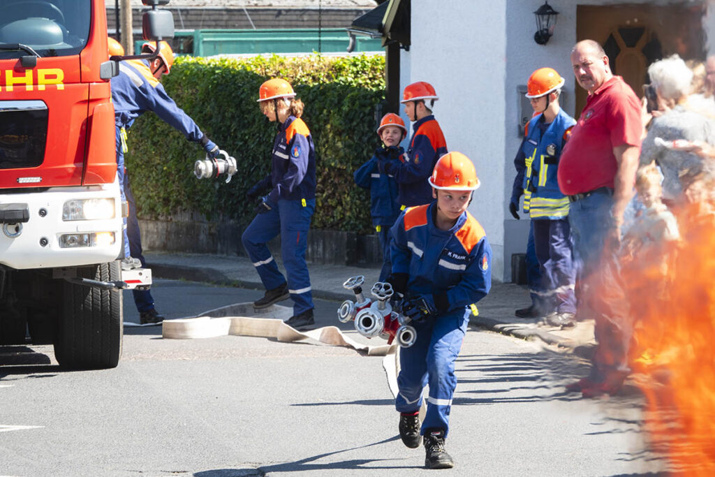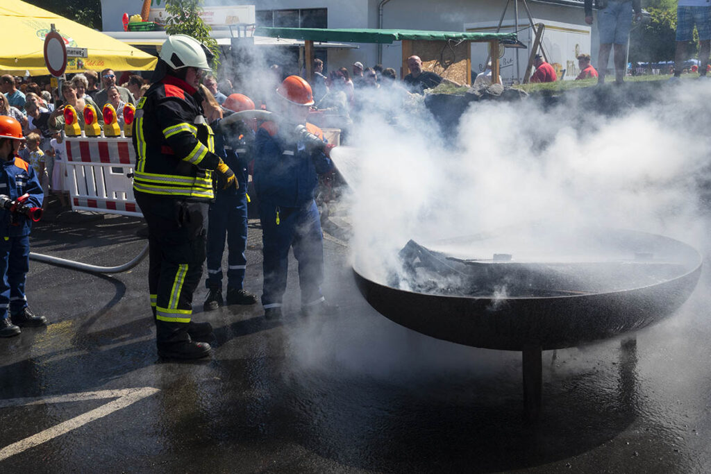 Ein Höhepunkt des Festes war die Übung der Jugendfeuerwehr Puderbach. Unter großem Applaus entzündeten die Wehrleute in einer Feuerschale Einwegpaletten, um dann mit drei C-Rohren die Brandbekämpfung aufzubauen. Die Jugendlichen meisterten die Aufgabe routiniert und ernteten dafür viel Anerkennung aus den Reihen der Zuschauer.