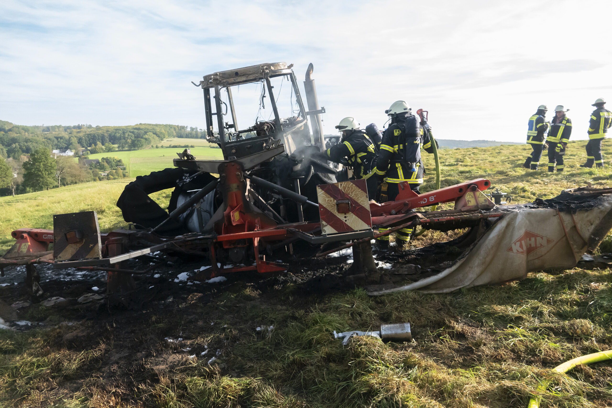 Die Flammen waren schnell im Griff, aber der große Traktor war nicht mehr zu retten. Auch eines der beiden Mähwerke wurde stark in Mitleidenschaft gezogen. Der DRK-Ortsverein Puderbach löste den mitalarmierten Regelrettungsdienst ab und stellte den Schutz der Feuerwehrkameraden sicher. Ein Eingreifen war von deren Seite zum Glück nicht erforderlich.